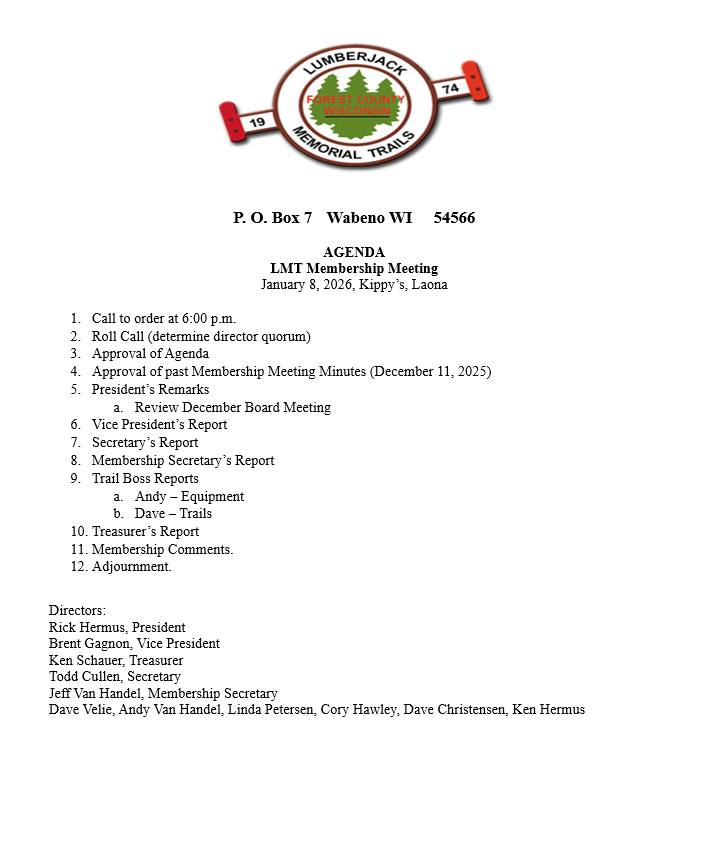 Save the date for Thursday, January 8, 2026, meeting starting at 6:00 pm. We will be meeting at the Kippy’s Bar and Grill, 4863 Elm St., Laona. We hope you can join us for our meeting.