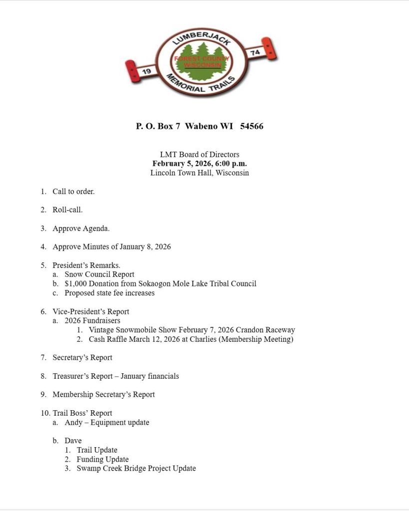 All are welcome to attend the monthly LMT Board Meeting. Our next Director’s meeting will be Thursday, February 5, 2026 . We will be meeting at the Lincoln Town Hall, 5376 County Hwy W, Crandon, WI 54520. We will be starting at 6:00 p.m.