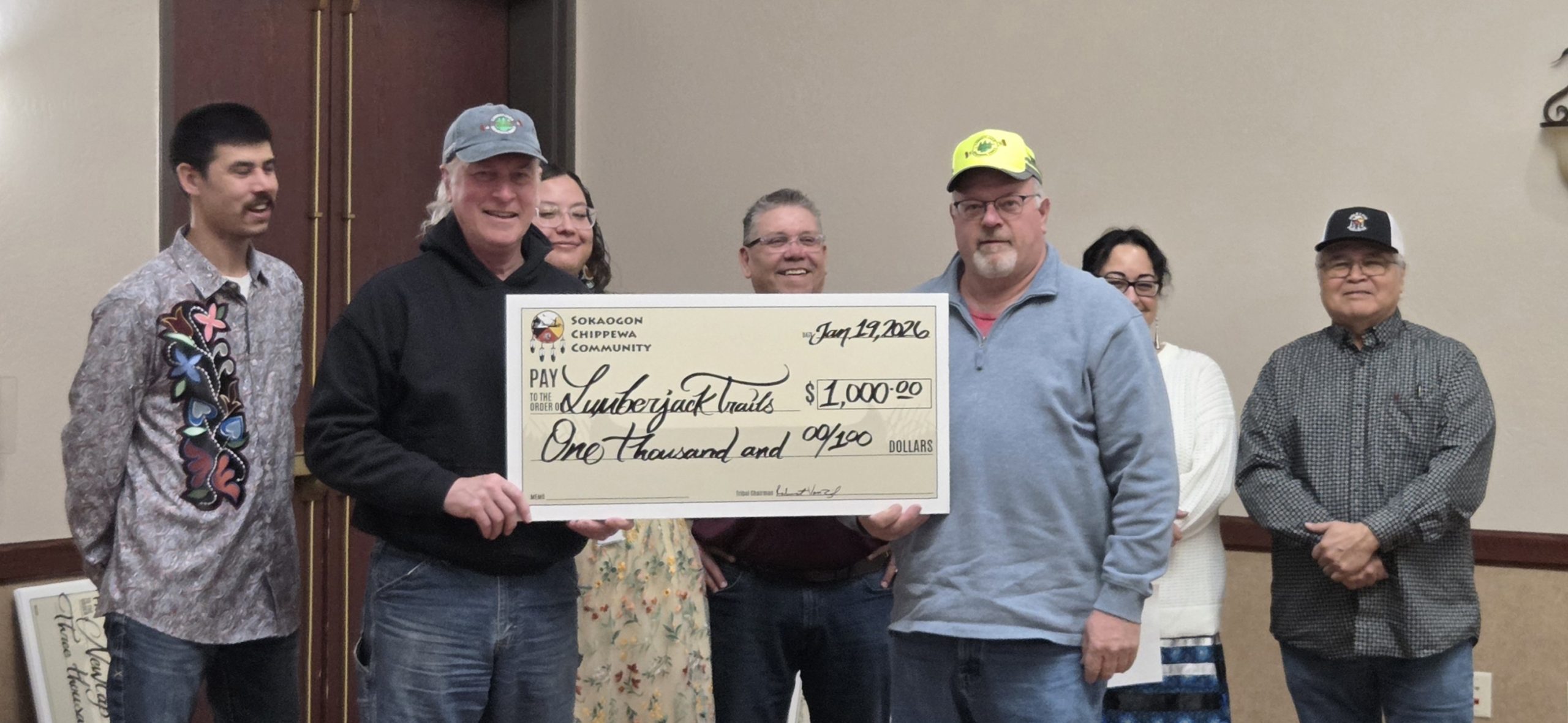 On January 19, 2026, the Sokaogon Chippewa Community (Mole Lake) Tribe distributed almost $100,000 to local organizations, including Lake Associations, municipalities, Fire Departments and more. The Lumberjack Memorial Trails Snowmobile Club was one of many to receive this funding from the Tribal Council. Pictured are LMT President Rick Hermus and Trail Boss Dave Velie, along with several members of the Sokaogon Mole Lake Tribal Council, accepting the $1,000 grant to be used for trail maintenance. It was a great event, demonstrating how the greater Forest County Community is working together to improve our quality of life, safeguard our environment, and promote tourism. Thank you to the Sokaogon Mole Lake Community for being such a great partner in Forest County.
